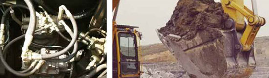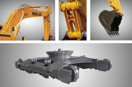 ♦ 选取重载型动臂、矿山专用的斗杆、加强型的上架、带重载防护底板的下架;