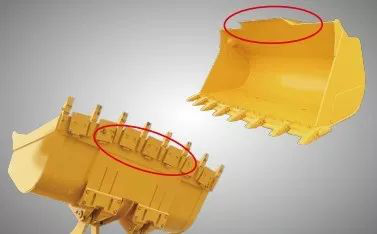 铲斗设计有防落物导流板,防止物料后落,有效保护动臂和油缸;斗壁内侧加强、斗底加耐磨板设计。